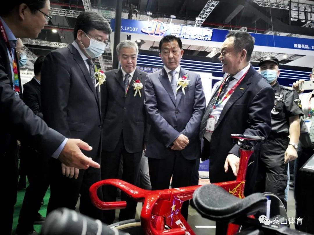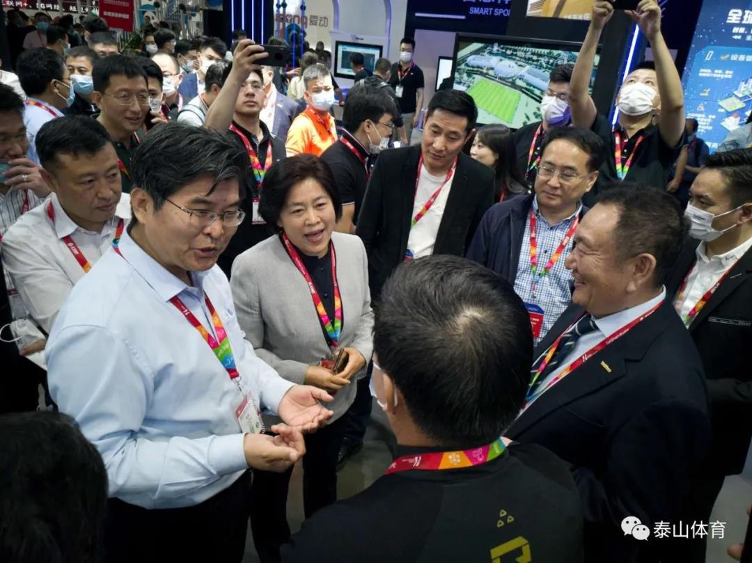 中国体育用品业联合会主席李桦、国家体育总局青少年体育司司长王立伟在6686体育产业集团副董事长卞青峰陪同下参观6686体育展厅。